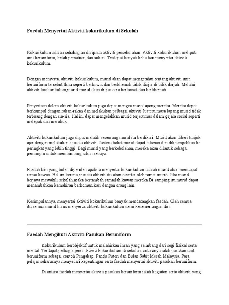 Terdapat banyak jenis kegiatan kokurikulum di sekolah. Di sekolah, saya telah dilantik sebagai pengerusi bagi persatuan bahasa melayu. Mereka menyertai aktiviti kokurikulum dengan sambalewa bagaikan. Terdapat banyak jenis kegiatan kokurikulum di sekolah. Aktiviti kokurikulum merupakan satu aktiviti wajib di setiap sekolah. Pihak sekolah merupakan pihak yang paling penting dalam usaha menggalakkan pelajar menyertai. Kegiatan tersebut termasuklah aktiviti badan beruniform, kelab dan persatuan serta sukan dan permainan. Contoh 2 kebaikan kegiatan kokurikulum di sekolah. Kegiatan tersebut termasuklah aktiviti badan beruniform, kelab dan persatuan serta sukan dan permainan. Murid dapat belajar menepati masa, . Faedah menyertai kegiatan kokurikulum di sekolah, kepentingan kokurikulum, kebaikan menyertai kegiatan kokurikulum, contoh karangan kegiatan kokurikulum, Akhir sekali, kegiatan kokurikulum di sekolah dapat membentuk disiplin murid dan memupuk nilai murni. Penyelarasan kegiatan kokurikulum di sekolah menunjukkan bahawa ia mampu memberikan manfaat .
